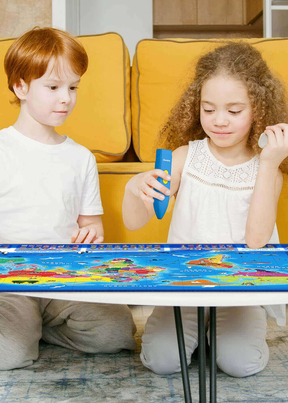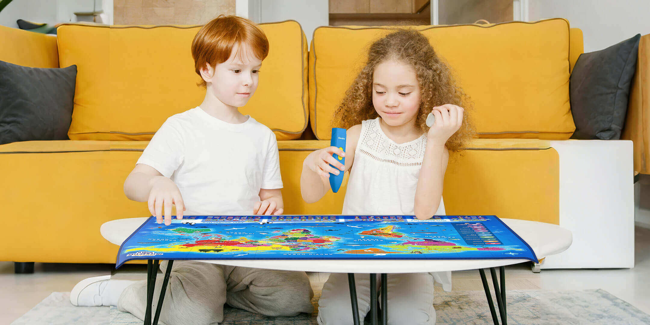 All interactive bilingual maps feature hidden treasures, including the following themes: World Map, USA Map, Dinosaurs, and Space.