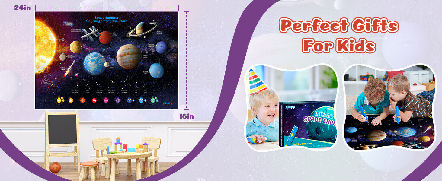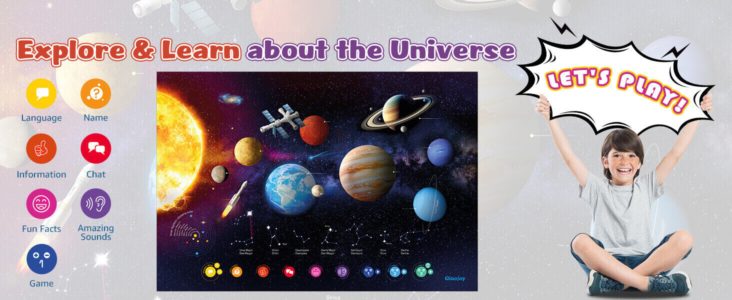 - 【Diverse Learning Content】With 17 touchable celestial bodies and 2 spacecraft, each with its own story and sound. Space poster includes over 500 fundamental astronomy facts.Through games and touch-based storytelling, knowledge about the solar system's stars and majestic planets is conveyed in an engaging and inspiring way. Tapping icons on the interstellar poster reveals the sounds of different celestial bodies. Space poster allows children to explore the mysteries of the universe audiovisually.