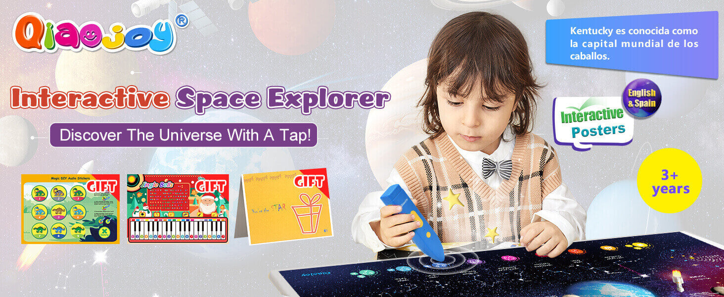 - 【Innovative Interactive Design】Solar system poster features 9 modules, including bilingual mode, celestial names, information, chat, fun facts, amazing sounds, and three games. Each touch of the interactive poster with the audio pen reveals fascinating facts and stories about the celestial body. With bilingual support (English and Spanish) and personalized voiceovers, space explorer caters to children from different cultural backgrounds, making learning more enjoyable.